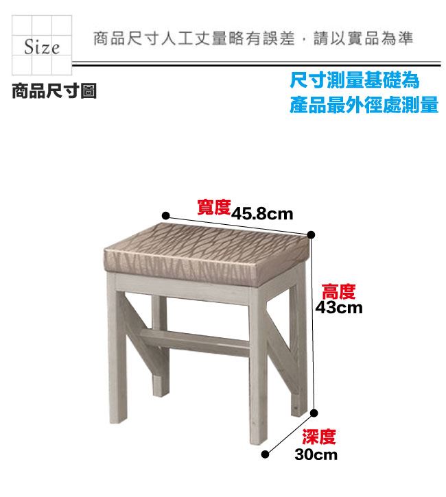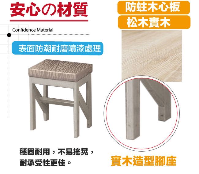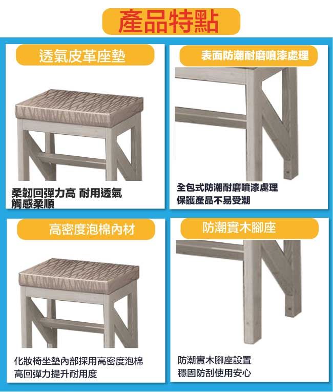 材質 | ◆產品名稱:【綠家居】杰拉透氣皮革實木化妝椅 尺寸:(寬)45.8x(深)30(高)43公分 ◆材質: 材質:松木實木+防蛀木心板+防潮耐磨腳座+透氣柔韌皮革+高密度泡棉 噴漆:防潮耐磨噴漆處理