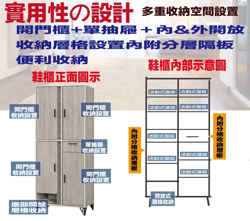採用開門櫃+單抽屜+內&外開放層格等收納空間設計