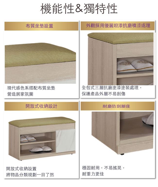 商品介紹 | 【綠家居】扎爾 時尚2.6尺座鞋櫃/收納櫃 橡木紋色系+現代簡約風格+安心材質製造,整體採用防蛀木心板+透氣亞麻布+防潮耐磨腳座等安心材質製造,搭配採用開放式收納收納空間設計,全由專人配送到家,專業安心服務,替你省下更多時間! 【商品特色】 橡木紋色系+現代簡約風格+安心材質製造,使用放心+搭配居家更便利 採用防蛀木心板+透氣亞麻布+防潮耐磨腳座等安心材質製造 採用開放式收納收納空間設計 此商品不需要DIY組立,此商品為組立後之成品 品質保證、專業設計、貼心服務 全由專人配送到家,專業安心服務,替您省下更多時間 |