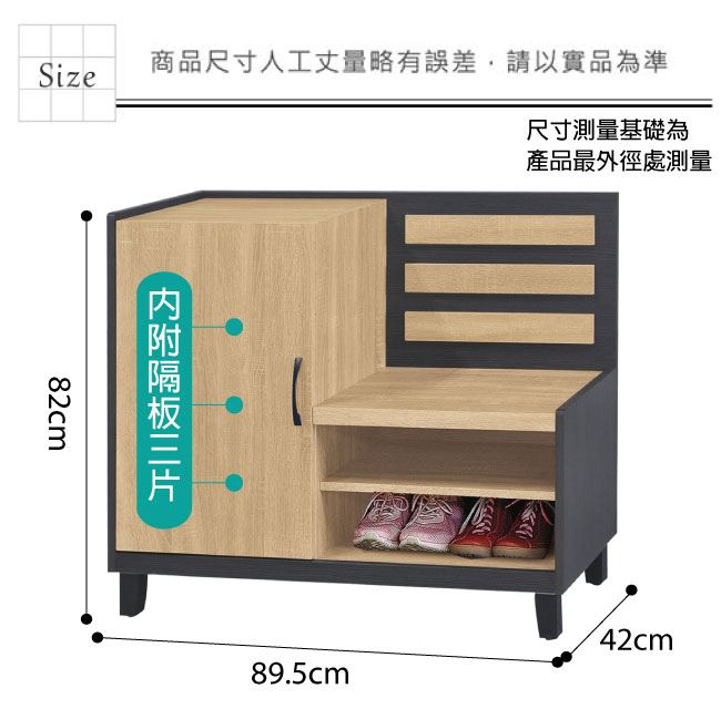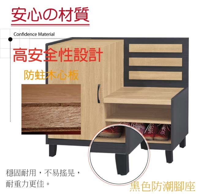 材質 | ◆產品名稱: 【綠家居】法加亞 雙色3尺單門座鞋櫃(三色可選) 尺寸:(寬)89.5x(深)42x(高)82/公分 ◆材質: 材質:防蛀木心板+防潮耐磨腳座+防夾手緩衝門片五金 噴漆:防潮耐磨噴漆處理