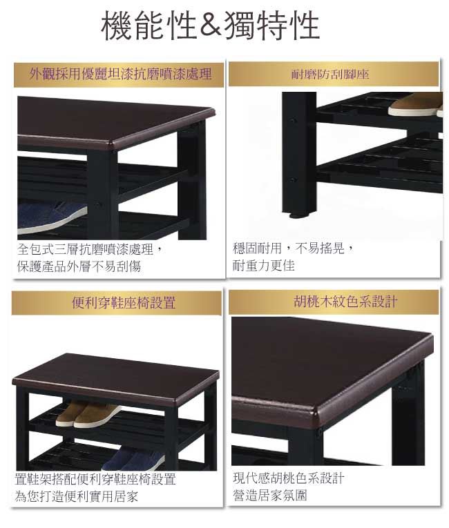 商品介紹 | 【綠家居】亞博斯 胡桃色2.8尺開放式座鞋架 胡桃木紋色系+現代簡約風格+安心材質製造,整體採用防蛀木心板+防潮MDF板材外貼皮+防潮耐磨腳座等安心材質製造,產品外層採用防潮耐磨噴漆處理搭配採用穿鞋坐板+開放式二層格收納等收納空間設計,全由專人配送到家,專業安心服務,替你省下更多時間! 【商品特色】 胡桃木紋色系+現代簡約風格+安心材質製造,使用放心+搭配居家更便利 採用防蛀木心板+防潮MDF板材外貼皮+防潮耐磨腳座等安心材質製造 產品外層採用防潮耐磨噴漆處理 搭配採用穿鞋坐板+開放式二層格收納等收納空間設計 此商品不需要DIY組立,此商品為組立後之成品 品質保證、專業設計、貼心服務 全由專人配送到家,專業安心服務,替您省下更多時間 |