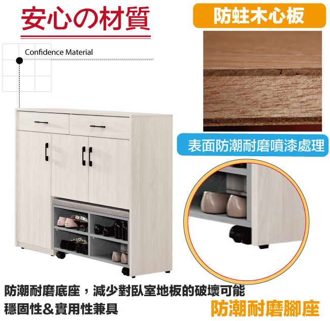 材質 | ◆產品名稱:【綠家居】摩克4尺三門二抽多功能鞋櫃組合 尺寸:(寬)120x(深)40(高)110/公分 ◆材質: 材質:防蛀木心板+防潮耐磨腳座+防夾手緩衝門片五金+五金滑軌結構 噴漆:防潮耐磨噴漆處理