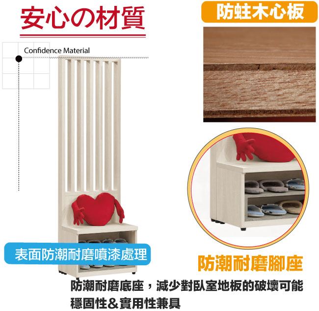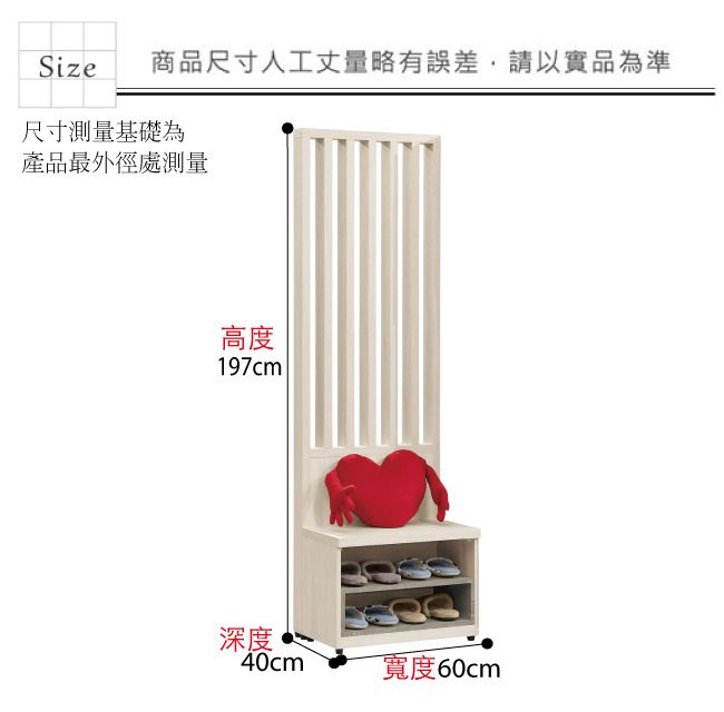 材質 | ◆產品名稱:【綠家居】波絲2尺高玄關屏風坐鞋櫃組合 尺寸:(寬)60x(深)40(高)197公分 ◆材質: 材質:防蛀木心板+防潮耐磨腳座 噴漆:防潮耐磨噴漆處理