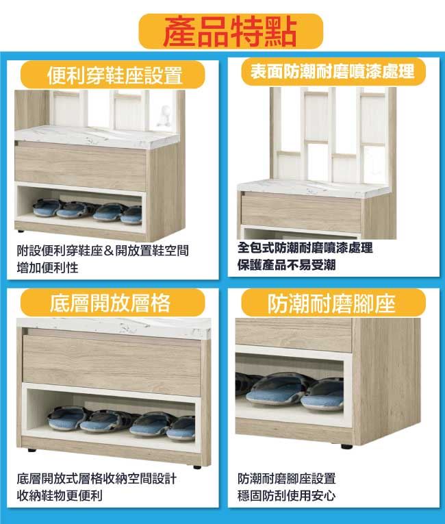 商品 介紹 | 【綠家居】羅娜2尺單抽高玄關屏風坐鞋櫃組合 木紋雙色系+現代簡約風格+安心材質製造,整體採用防蛀木心板+防潮耐磨腳座+五金滑軌結構等安心材質製造,產品外層採用防潮耐磨噴漆處理搭配採用單抽屜+穿鞋椅凳設置+開放式層格等收納空間設計,全由專人配送到家,專業安心服務,替你省下更多時間! 【商品特色】 木紋雙色系+現代簡約風格+安心材質製造,使用放心+搭配居家更便利 採用防蛀木心板+防潮耐磨腳座+五金滑軌結構等安心材質製造 產品外層採用防潮耐磨噴漆處理 採用單抽屜+穿鞋椅凳設置+開放式層格等收納空間設計 此商品不需要DIY組立,此商品為組立後之成品 品質保證、專業設計、貼心服務 全由專人配送到家,專業安心服務,替您省下更多時間 |
