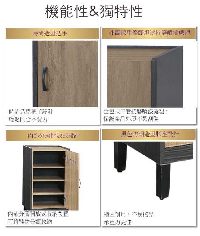 商品介紹 | 【綠家居】法加亞 雙色1.4尺單門低鞋櫃(三色可選) 三色可選+現代簡約風格+安心材質製造,整體採用防蛀木心板+防潮耐磨腳座+防夾手緩衝門片五金等安心材質製造,產品外層採用防潮耐磨噴漆處理搭配採用開門櫃+內開放式收納等收納空間設計,全由專人配送到家,專業安心服務,替你省下更多時間! 【商品特色】 三色可選+現代簡約風格+安心材質製造,使用放心+搭配居家更便利 採用防蛀木心板+防潮耐磨腳座+防夾手緩衝門片五金等安心材質製造 產品外層採用防潮耐磨噴漆處理 搭配採用開門櫃+內開放式收納等收納空間設計 此商品不需要DIY組立,此商品為組立後之成品 品質保證、專業設計、貼心服務 全由專人配送到家,專業安心服務,替您省下更多時間 |