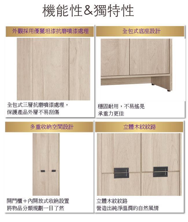 商品介紹 | 【綠家居】喬安 時尚2尺四門高鞋櫃/玄關櫃 橡木紋色系+現代簡約風格+安心材質製造,整體採用防蛀木心板+全包式底座+防夾手緩衝門片五金等安心材質製造,外層採用優利坦全包式耐磨噴漆處理搭配開門櫃+內開放式多層格等收納設計,全由專人配送到家,專業安心服務,替你省下更多時間! 【商品特色】 橡木紋色系+現代簡約風格+安心材質製造,使用放心+搭配居家更便利 採用防蛀木心板+全包式底座+防夾手緩衝門片五金等安心材質製造 開門櫃+內開放式多層格等收納設計 此商品不需要DIY組立,此商品為組立後之成品 品質保證、專業設計、貼心服務 全由專人配送到家,專業安心服務,替您省下更多時間 |