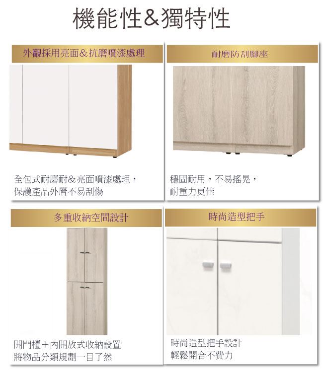 商品介紹 | 【綠家居】杜斯 時尚2尺四門高玄關櫃/鞋櫃(三色可選) 三色可選+現代簡約風格+安心材質製造,整體採用防蛀木心板+防潮耐磨腳座+防夾手緩衝門片五金等安心材質製造,外層採用優利坦全包式耐磨&亮面噴漆處理搭配開門櫃+內開放式多層格等收納設計,全由專人配送到家,專業安心服務,替你省下更多時間! 【商品特色】 三色可選+現代簡約風格+安心材質製造,使用放心+搭配居家更便利 採用防蛀木心板+防潮耐磨腳座+防夾手緩衝門片五金等安心材質製造 開門櫃+內開放式多層格等收納設計 此商品不需要DIY組立,此商品為組立後之成品 品質保證、專業設計、貼心服務 全由專人配送到家,專業安心服務,替您省下更多時間 |