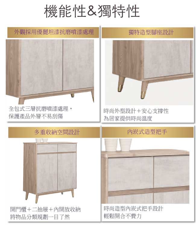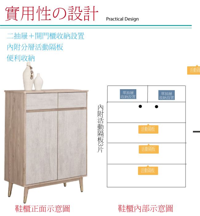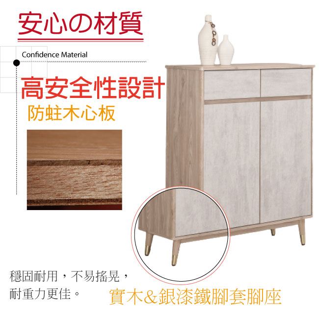 商品介紹 | 【綠家居】喬普 雙色2.7尺單門二抽鞋櫃 木紋雙色系+現代簡約風格+安心材質製造,整體採用防蛀木心板+五金滑軌結構+實木&銀漆鐵腳套腳座+防夾手緩衝門片五金等安心材質製造,外層採用優利坦全包式耐磨噴漆處理搭配開門櫃+二抽屜+內開放式收納等收納設計,全由專人配送到家,專業安心服務,替你省下更多時間! 【商品特色】 木紋雙色系+現代簡約風格+安心材質製造,使用放心+搭配居家更便利 採用防蛀木心板+五金滑軌結構+實木&銀漆鐵腳套腳座+防夾手緩衝門片五金等安心材質製造 開門櫃+二抽屜+內開放式收納等收納設計 此商品不需要DIY組立,此商品為組立後之成品 品質保證、專業設計、貼心服務 全由專人配送到家,專業安心服務,替您省下更多時間 |