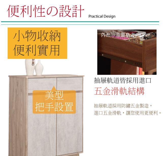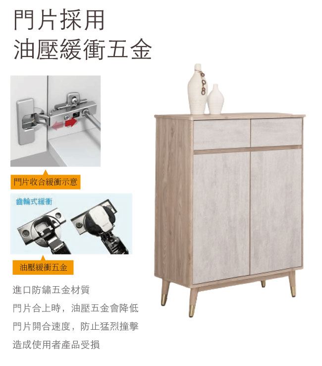 防夾手緩衝五金+五金滑軌結構- 開門櫃+二抽屜+內&外開放