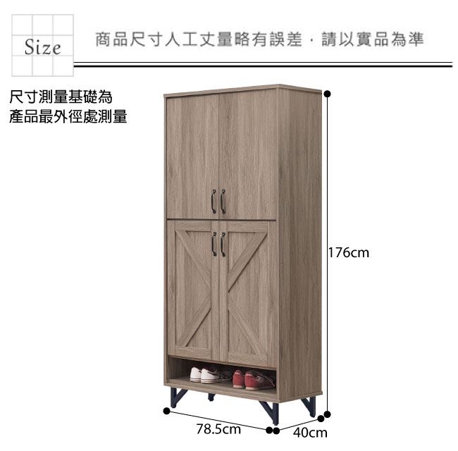 材質 | ◆產品名稱: 【綠家居】歐格利 現代2.6尺四門中高鞋櫃/玄關櫃 產品尺寸: 尺寸:(寬)78.5(深)40x(高)176/公分 ◆材質: 材質:防蛀木心板+黑鐵烤漆腳座+防夾手緩衝門片五金 塗漆:優利坦全包式耐磨噴漆處理