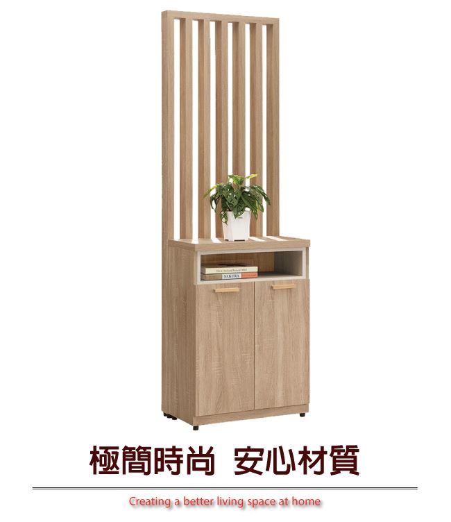 商品 介紹 | 【綠家居】伊瑟隆 時尚2尺二門屏風玄關櫃/高鞋櫃 橡木紋色系+現代簡約風格+安心材質製造,整體採用防蛀木心板+防潮耐磨腳座+防夾手緩衝門片五金等安心材質製造,產品外層採用防潮耐磨噴漆處理搭配搭配採用開門櫃+內&外開放式收納層格等收納空間設計,全由專人配送到家,專業安心服務,替你省下更多時間! 【商品特色】 橡木紋色系+現代簡約風格+安心材質製造,使用放心+搭配居家更便利 採用防蛀木心板+防潮耐磨腳座+防夾手緩衝門片五金等安心材質製造 產品外層採用防潮耐磨噴漆處理 搭配採用開門櫃+內&外開放式收納層格等收納空間設計 此商品不需要DIY組立,此商品為組立後之成品 品質保證、專業設計、貼心服務 全由專人配送到家,專業安心服務,替您省下更多時間 |