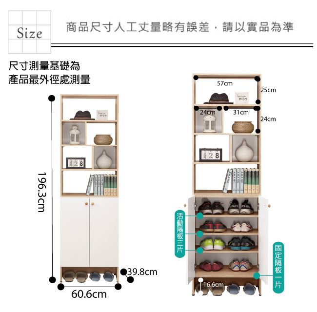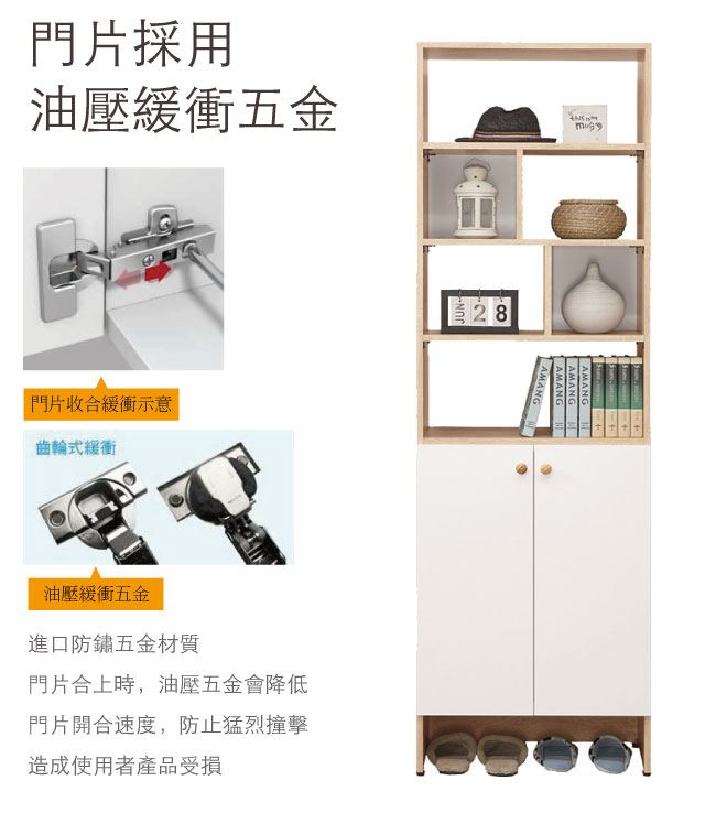 材質 | ◆產品名稱: 【綠家居】奧蘿瑟 時尚2尺二門玄關櫃/高鞋櫃(二色可選) 尺寸:(寬)60.6x(深)39.8x(高)196.3/公分 ◆材質: 材質:防蛀木心板+防潮耐磨腳座+防夾手緩衝門片五金 噴漆:防潮耐磨&亮面噴漆處理