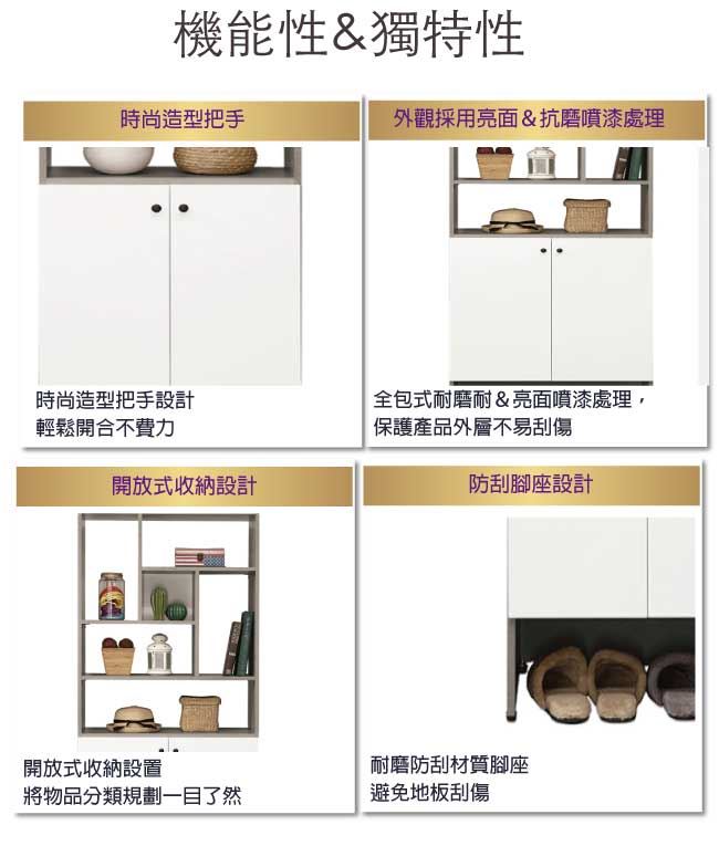 商品 介紹 | 【綠家居】奧蘿瑟 時尚2.7尺二門玄關櫃/高鞋櫃(二色可選) 二色可選+現代簡約風格+安心材質製造,整體採用防蛀木心板+防潮耐磨腳座+防夾手緩衝門片五金等安心材質製造,產品外層採用防潮耐磨&亮面噴漆處理搭配搭配採用開門櫃+內&外開放式收納層格等收納空間設計,全由專人配送到家,專業安心服務,替你省下更多時間! 【商品特色】 二色可選+現代簡約風格+安心材質製造,使用放心+搭配居家更便利 採用防蛀木心板+防潮耐磨腳座+防夾手緩衝門片五金等安心材質製造 產品外層採用防潮耐磨&亮面噴漆處理 搭配採用開門櫃+內&外開放式收納層格等收納空間設計 此商品不需要DIY組立,此商品為組立後之成品 品質保證、專業設計、貼心服務 全由專人配送到家,專業安心服務,替您省下更多時間 |