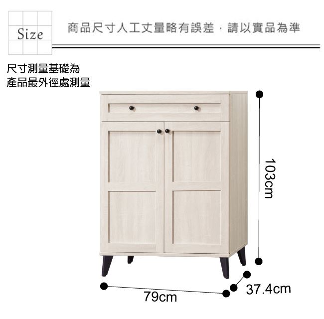 尺寸:(寬)79x(深)37.4(高)103公分 ◆材質: 材質:防蛀木心板+防潮黑漆腳座+五金滑軌結構+防夾手緩衝門片五金 噴漆:防潮耐磨噴漆處理