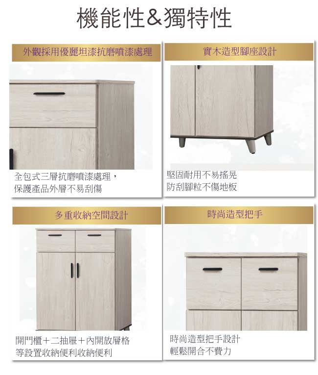 商 品 介 紹 | 【綠家居】華安2.7尺二門二抽鞋櫃 淺橡木紋色系+現代簡約風格+安心材質製造,整體採用防蛀木心板+防潮實木腳座+五金滑軌結構+現代美型把手+防夾手緩衝門片五金等安心材質製造,產品外層採用防潮耐磨噴漆處理搭配採用開門櫃+二抽屜+內開放層格等空間設計,全由專人配送到家,專業安心服務,替你省下更多時間! 【商品特色】 淺橡木紋色系+現代簡約風格+安心材質製造,使用放心+搭配居家更便利 採用防蛀木心板+防潮實木腳座+五金滑軌結構+現代美型把手+防夾手緩衝門片五金等安心材質製造 產品外層採用防潮耐磨噴漆處理 搭配採用開門櫃+二抽屜+內開放層格等空間設計 此商品不需要DIY組立,此商品為組立後之成品 全由專人配送到家,專業安心服務,替您省下更多時間 |
