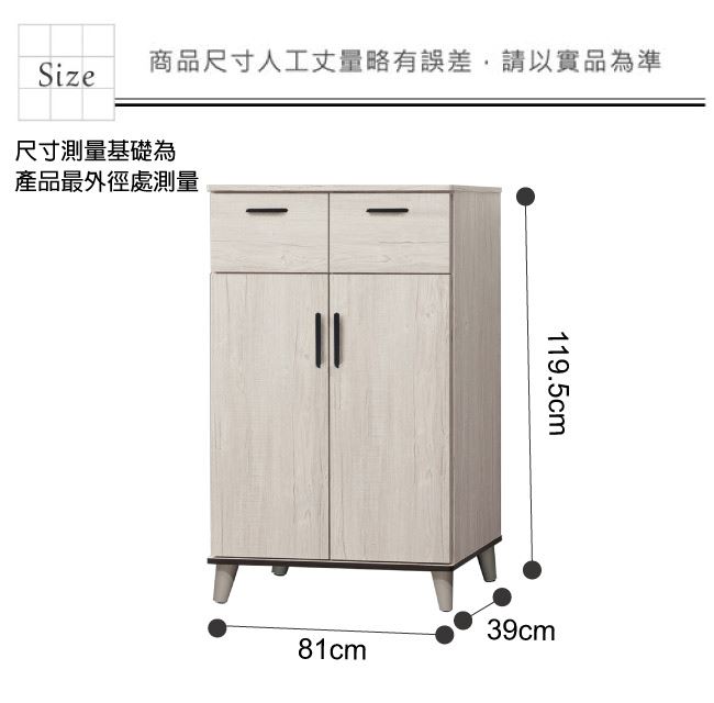尺寸:(寬)81x(深)39(高)119公分 ◆材質: 材質:防蛀木心板+防潮實木腳座+五金滑軌結構+防夾手緩衝門片五金 噴漆:防潮耐磨噴漆處理