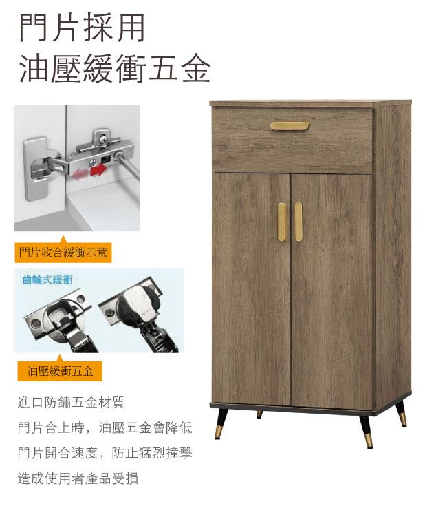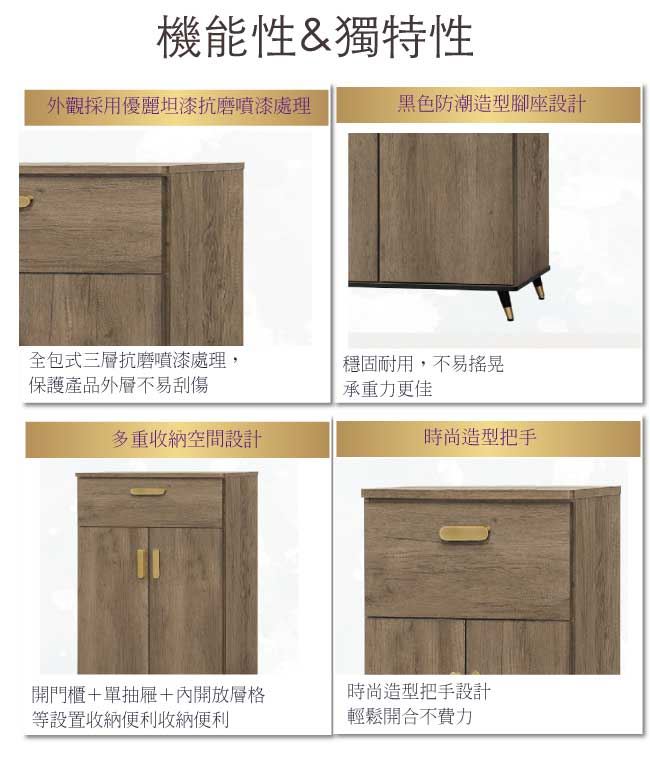 商 品 介 紹 | 【綠家居】普安2尺二門單抽鞋櫃 灰橡木紋色系+現代簡約風格+安心材質製造,整體採用防蛀木心板+防鏽黑漆腳座+五金滑軌結構+現代美型把手+防夾手緩衝門片五金等安心材質製造,產品外層採用防潮耐磨噴漆處理搭配採用二開門櫃+單抽屜+內開放層格等空間設計,全由專人配送到家,專業安心服務,替你省下更多時間! 【商品特色】 灰橡木紋色系+現代簡約風格+安心材質製造,使用放心+搭配居家更便利 採用防蛀木心板+防鏽黑漆腳座+五金滑軌結構+現代美型把手+防夾手緩衝門片五金等安心材質製造 產品外層採用防潮耐磨噴漆處理 搭配採用二開門櫃+單抽屜+內開放層格等空間設計 此商品不需要DIY組立,此商品為組立後之成品 全由專人配送到家,專業安心服務,替您省下更多時間 |
