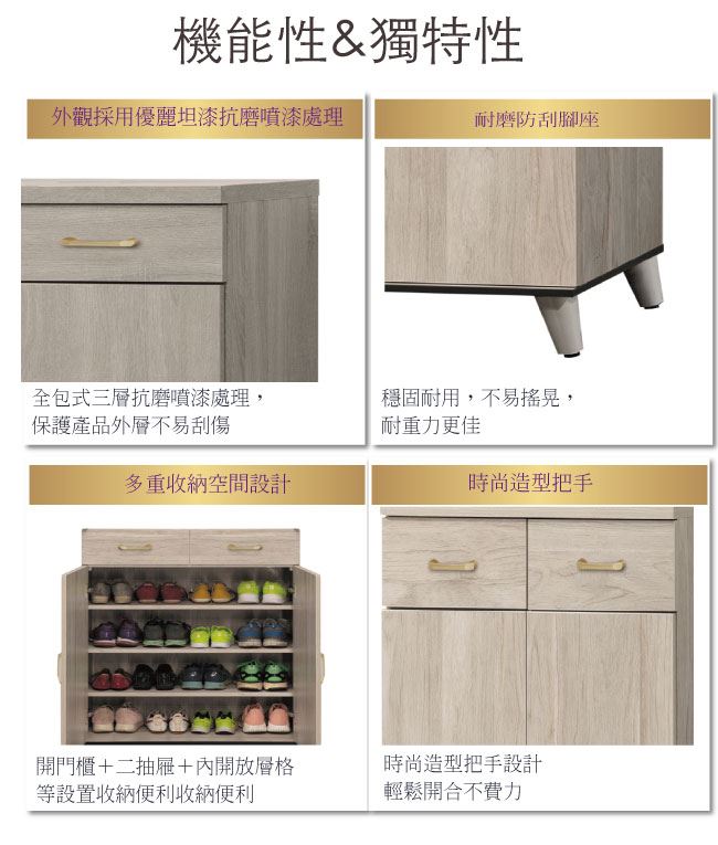 商 品 介 紹 | 【綠家居】梅納2.6尺二門二抽鞋櫃(二色可選) 二色可選+現代簡約風格+安心材質製造,整體採用防蛀木心板+防潮耐磨腳座+五金滑軌結構+現代美型把手等安心材質製造,產品外層採用防潮耐磨噴漆處理搭配採用二開門櫃+二抽屜+內開放層格等空間設計,全由專人配送到家,專業安心服務,替你省下更多時間! 【商品特色】 二色可選+現代簡約風格+安心材質製造,使用放心+搭配居家更便利 採用防蛀木心板+防潮耐磨腳座+五金滑軌結構+現代美型把手等安心材質製造 產品外層採用防潮耐磨噴漆處理 搭配採用二開門櫃+二抽屜+內開放層格等空間設計 此商品不需要DIY組立,此商品為組立後之成品 全由專人配送到家,專業安心服務,替您省下更多時間 |