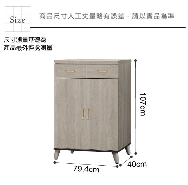 尺寸:(寬)79.4x(深)40(高)107公分 ◆材質: 材質:防蛀木心板+防潮耐磨腳座+五金滑軌結構 噴漆:防潮耐磨噴漆處理
