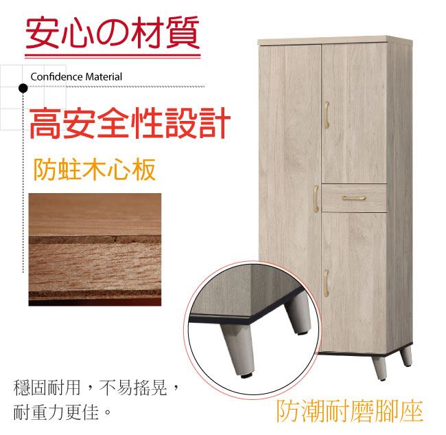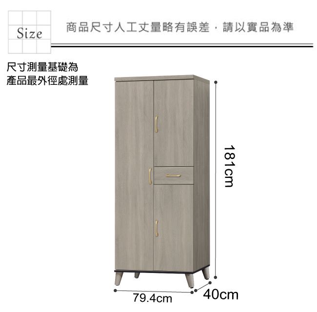 尺寸:(寬)79.4x(深)40(高)181公分 ◆材質: 材質:防蛀木心板+防潮耐磨腳座+五金滑軌結構 噴漆:防潮耐磨噴漆處理