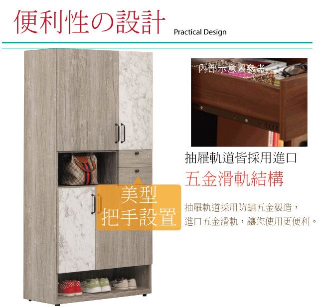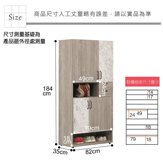 尺寸:(寬)82(深)35(高)184公分 ◆材質: 材質:防蛀木心板+防潮耐磨腳座+防夾手緩衝門片五金+五金滑軌結構 噴漆:防潮耐磨噴漆處理