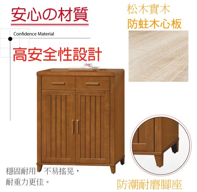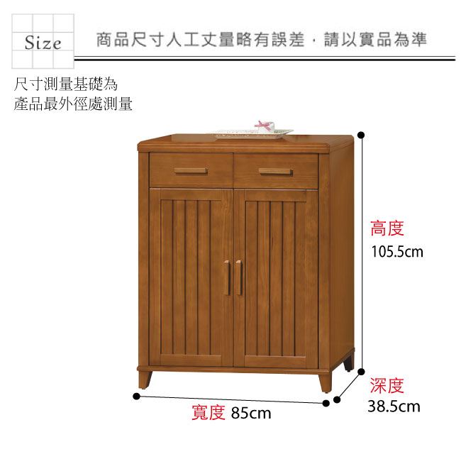 材質 | ◆產品名稱:【綠家居】梅利實木2.8尺二門雙抽鞋櫃 尺寸:(寬)85x(深)38.5(高)105.5/公分 ◆材質: 材質:松木實木+防蛀木心板+防刮耐磨腳座+五金滑軌結構 噴漆:防潮耐磨噴漆處理