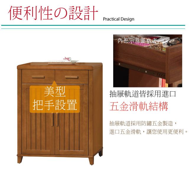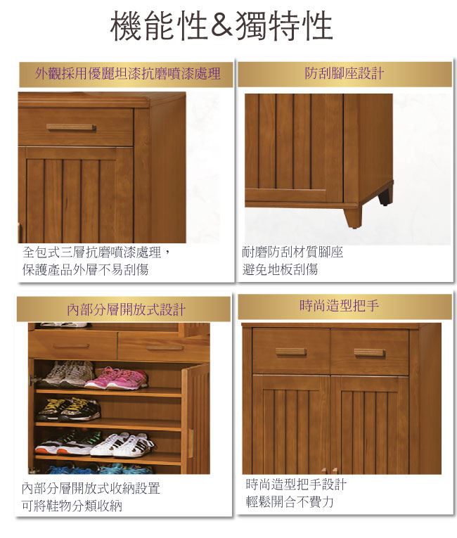 商品 介紹 | 【綠家居】梅利實木2.8尺二門雙抽鞋櫃 柚木紋色系+現代簡約風格+安心材質製造,整體採用松木實木+防蛀木心板+防刮耐磨腳座+五金滑軌結構等安心材質製造,產品外層採用防潮耐磨噴漆處理搭配採用開門櫃+二抽屜+內開放式收納等收納空間設計,全由專人配送到家,專業安心服務,替你省下更多時間! 【商品特色】 柚木紋色系+現代簡約風格+安心材質製造,使用放心+搭配居家更便利 採用松木實木+防蛀木心板+防刮耐磨腳座+五金滑軌結構等安心材質製造 產品外層採用防潮耐磨噴漆處理 搭配採用開門櫃+二抽屜+內開放式收納等收納空間設計 此商品不需要DIY組立,此商品為組立後之成品 品質保證、專業設計、貼心服務 全由專人配送到家,專業安心服務,替您省下更多時間 |