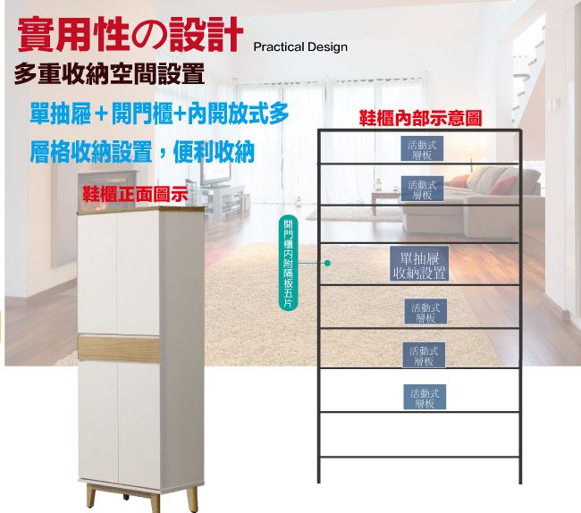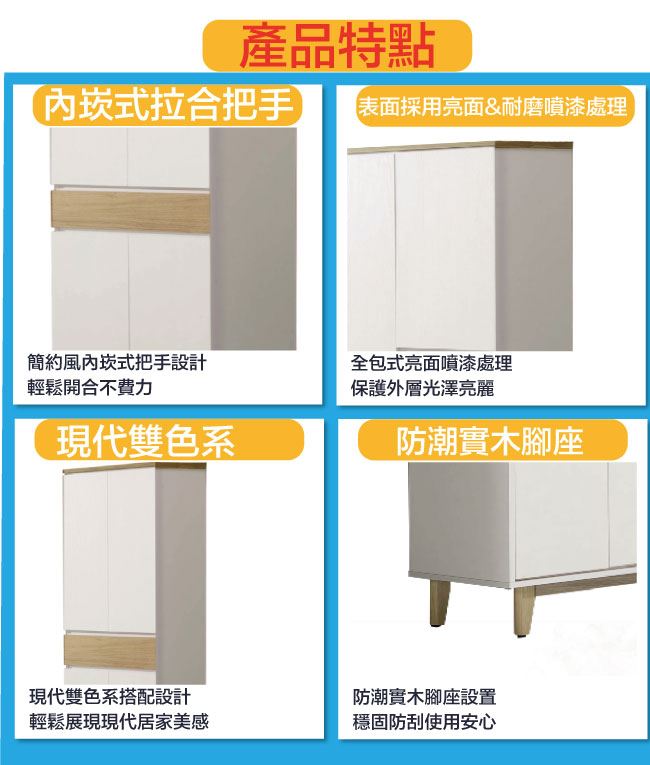 商品 介紹 | 【綠家居】奈吉亞雙色2尺四門單抽高玄關鞋櫃 木紋雙色系+現代簡約風格+安心材質製造,使用放心+搭配居家更便利,整體採用防蛀木心板+防夾手緩衝門片五金+五金滑軌結構+防潮耐磨腳座等材質搭配外層採用優莉坦耐磨&亮面全包式噴漆處理 ,採用開門櫃+單抽屜+內開放多層格等收納空間設計,全由專人配送到家,專業安心服務,替你省下更多時間! 【商品特色】 木紋雙色系+現代簡約風格+安心材質製造,使用放心+搭配居家更便利 防蛀木心板+防夾手緩衝門片五金+五金滑軌結構+防潮耐磨腳座等材質 採用開門櫃+單抽屜+內開放多層格等收納空間設計 此商品不需要DIY組立,此商品為組立後之成品 品質保證、專業設計、貼心服務 全由專人配送到家,專業安心服務,替您省下更多時間 |