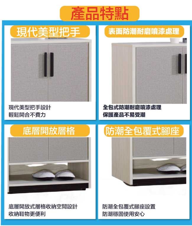 商品 介紹 | 【綠家居】波卡亞雙色2.7尺皮革二門玄關鞋櫃 木紋雙色系+現代簡約風格+安心材質製造,使用放心+搭配居家更便利,整體採用防蛀木心板+防潮耐磨腳座+外貼透氣皮革等材質搭配外層採用優莉坦耐磨全包式噴漆處理 ,採用開門櫃+內&外開放多層格等收納空間設計,全由專人配送到家,專業安心服務,替你省下更多時間! 【商品特色】 木紋雙色系+現代簡約風格+安心材質製造,使用放心+搭配居家更便利 防蛀木心板+防潮耐磨腳座+外貼透氣皮革等材質 採用開門櫃+內&外開放多層格等收納空間設計 此商品不需要DIY組立,此商品為組立後之成品 品質保證、專業設計、貼心服務 全由專人配送到家,專業安心服務,替您省下更多時間 |