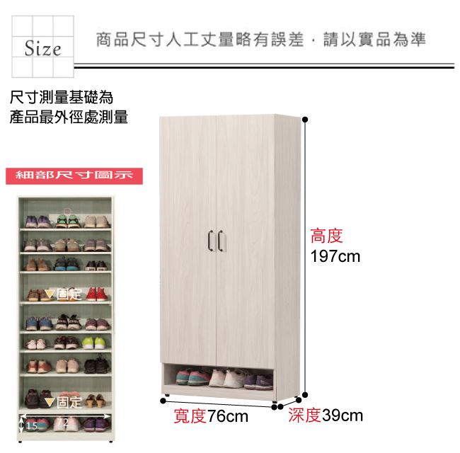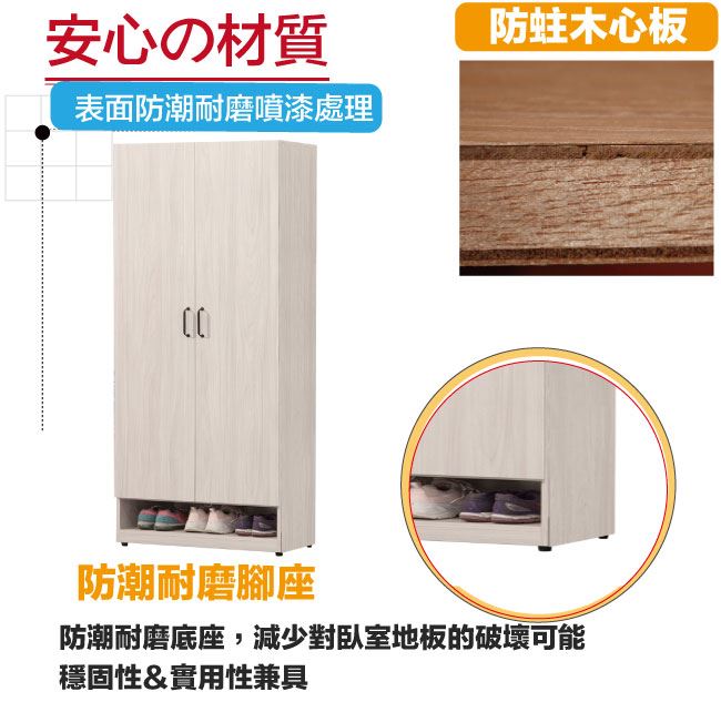 材質 | ◆產品名稱:【綠家居】布金2.5尺二門高鞋櫃 尺寸:(寬)76x(深)39(高)197公分 ◆材質: 材質:防蛀木心板+防潮耐磨腳座+防夾手緩衝門片五金 噴漆:防潮耐磨噴漆處理