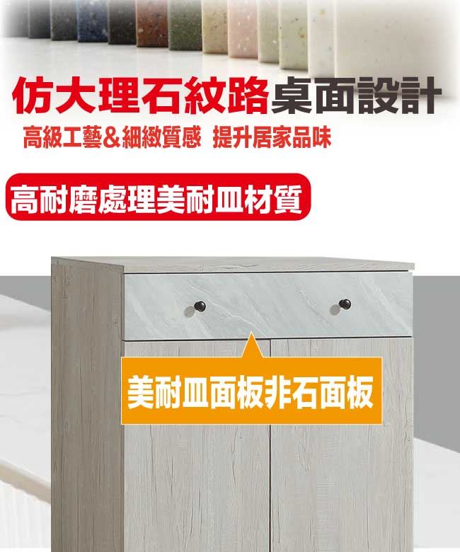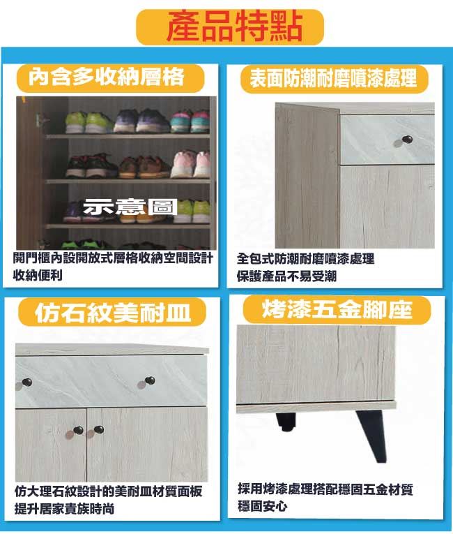 材質 | ◆產品名稱:【綠家居】蘿珊雙色2.6尺二門二抽鞋櫃 尺寸:(寬)79x(深)35x(高)103/公分 ◆材質: 材質:防蛀木心板+烤漆金屬腳座+仿大理石紋耐磨美耐皿面板+五金滑軌結構 表面防潮耐磨噴漆處理 |