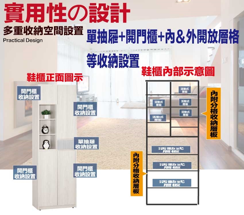 搭配採用開門櫃+單抽屜+內&外開放層格等收納空間設計