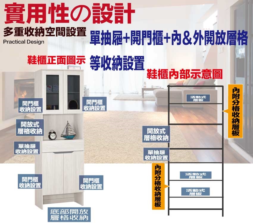 搭配採用開門櫃+單抽屜+內&外開放層格等收納空間設計