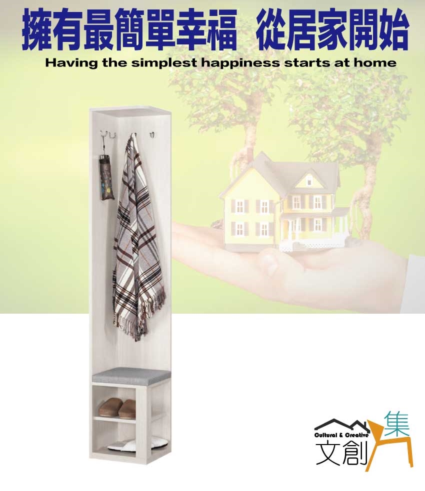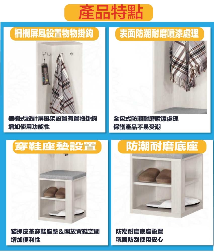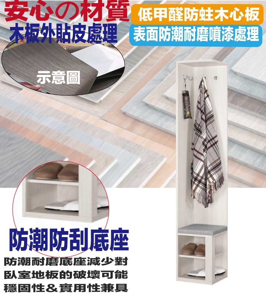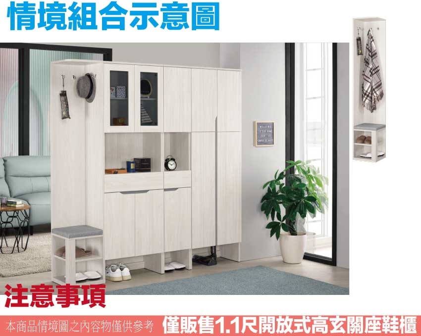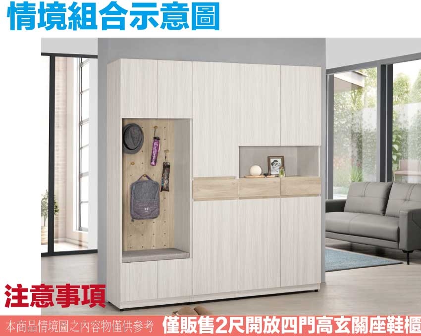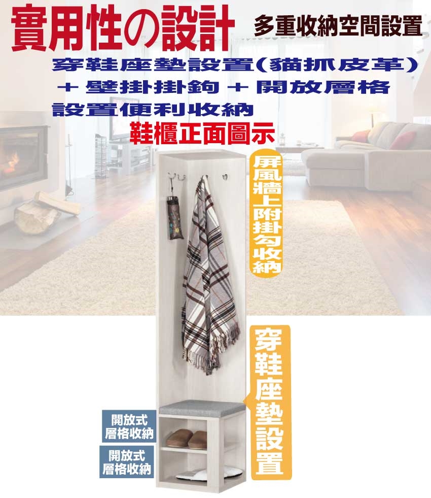 搭配採用開門櫃+開放層格+置物木棒掛勾(五隻可調整位置)+穿鞋椅坐墊設置等收納空間設計