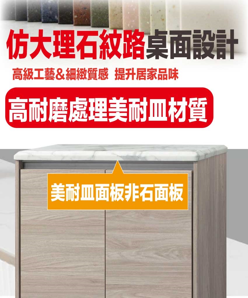 材質:防蛀木心板+防夾手緩衝門片五金+防潮耐磨底座+耐磨美耐皿桌面板