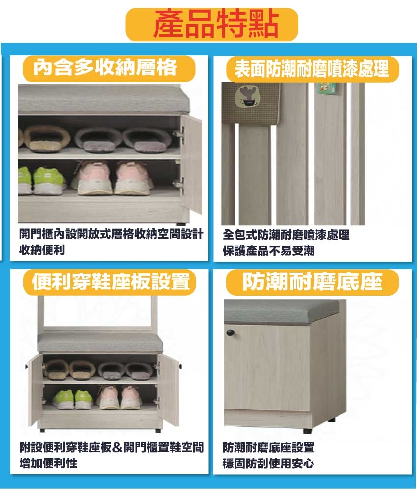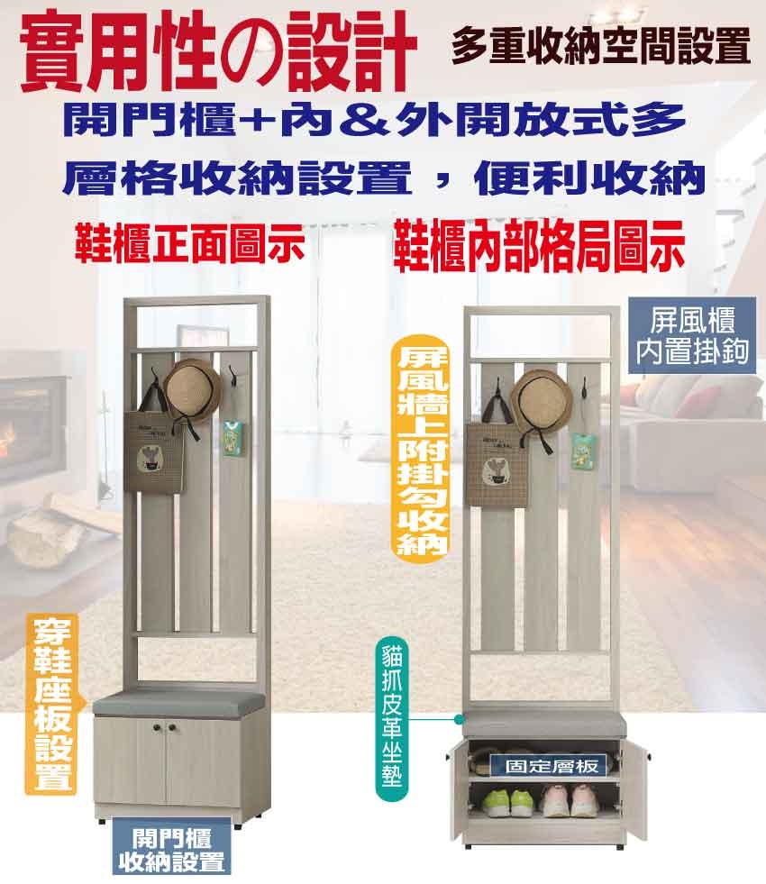 搭配採用開門櫃+內開放層格+便利穿鞋座板等收納空間設計