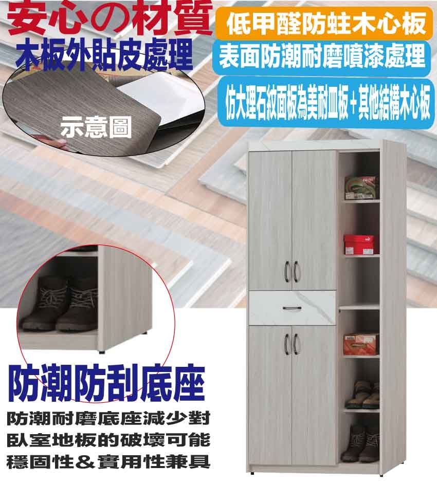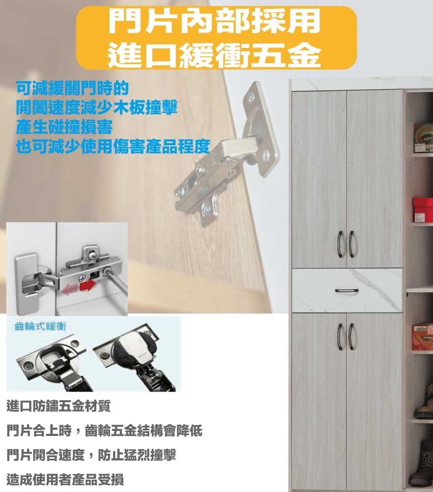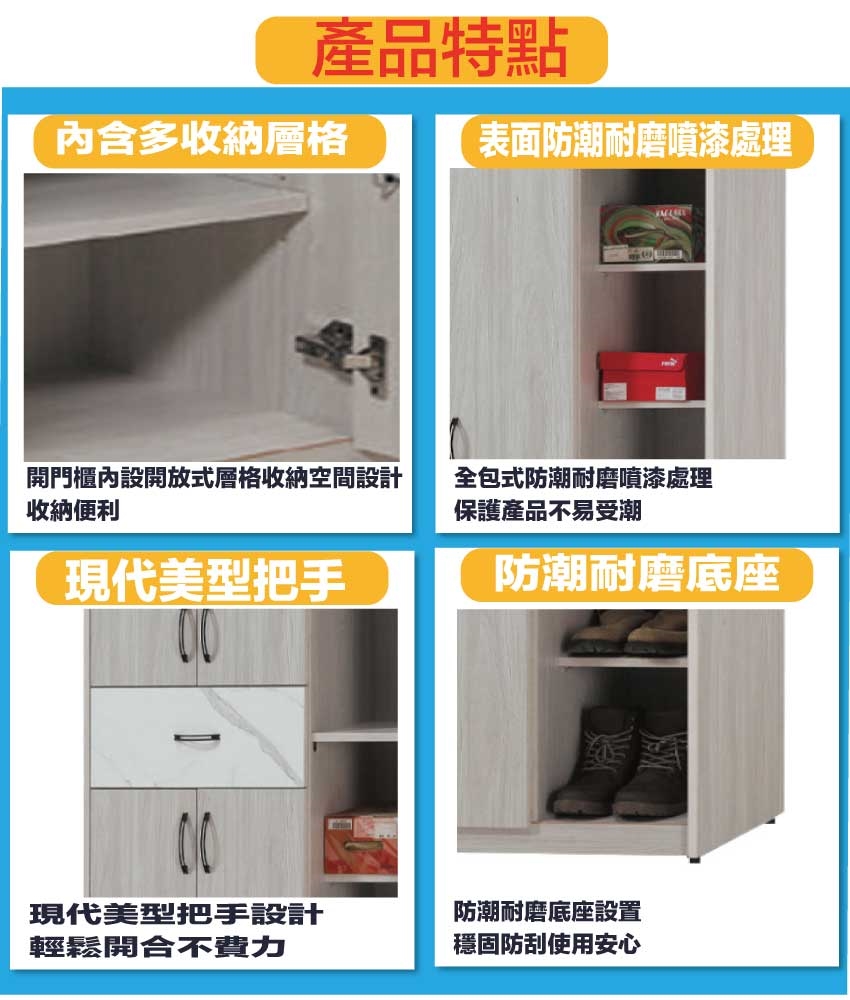 材質:防蛀木心板+耐磨美耐皿面板+防潮耐磨底座+防夾手緩衝門片五金+五金滑軌結構