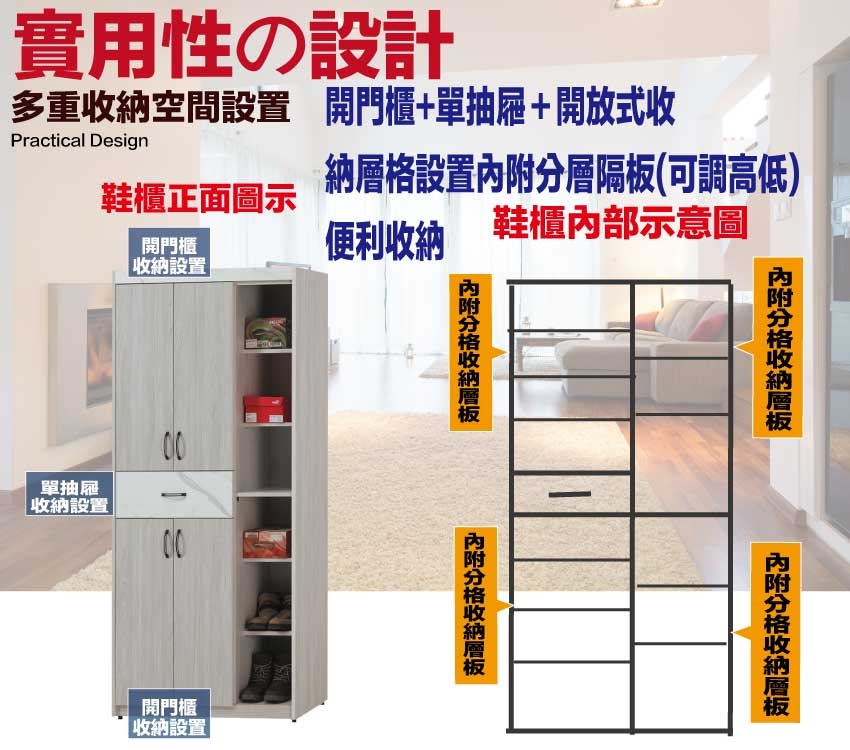 搭配採用開門櫃+二抽屜+內開放層格等收納空間設計