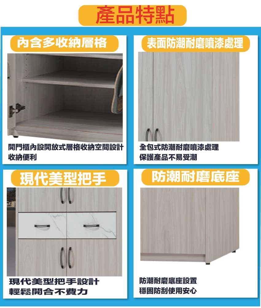 材質:防蛀木心板+耐磨美耐皿面板+防潮耐磨底座+防夾手緩衝門片五金+五金滑軌結構