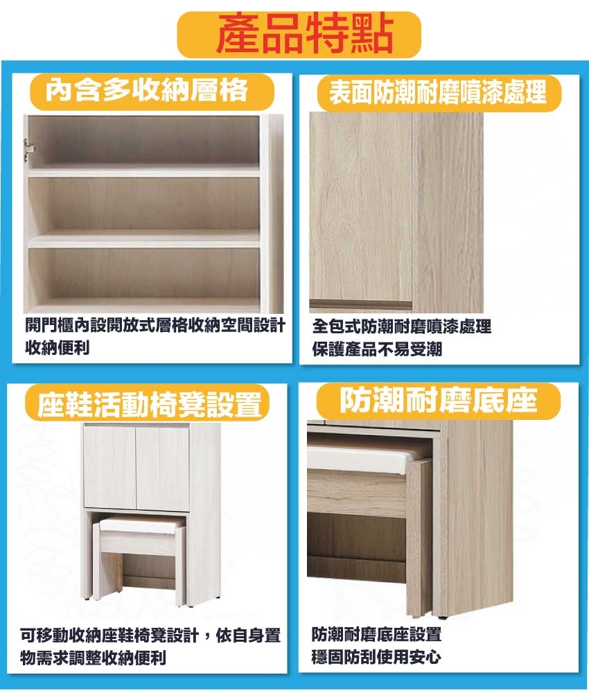搭配採用開門櫃+單抽屜+內開放層格+可移動座鞋椅凳等收納空間設計