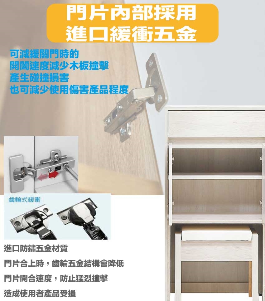 材質:防蛀木心板+五金滑軌結構+防刮耐磨腳座+防夾手緩衝門片五金