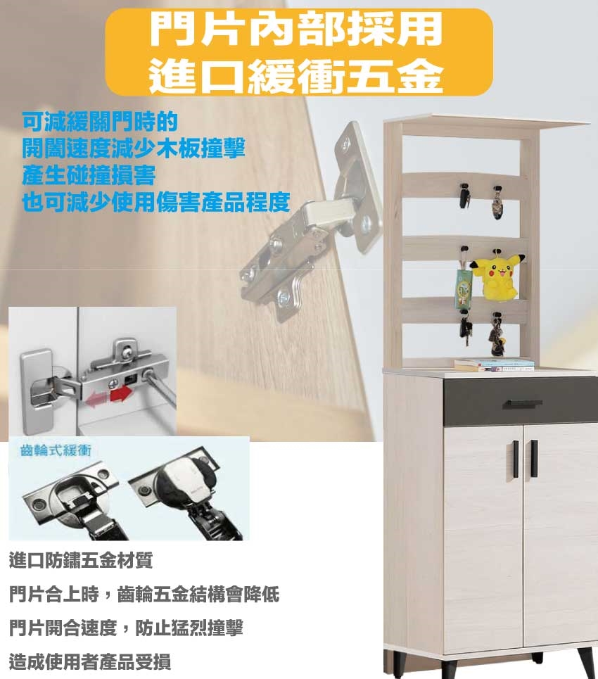 材質:防蛀木心板+五金滑軌結構+烤漆五金腳座+防夾手緩衝門片五金