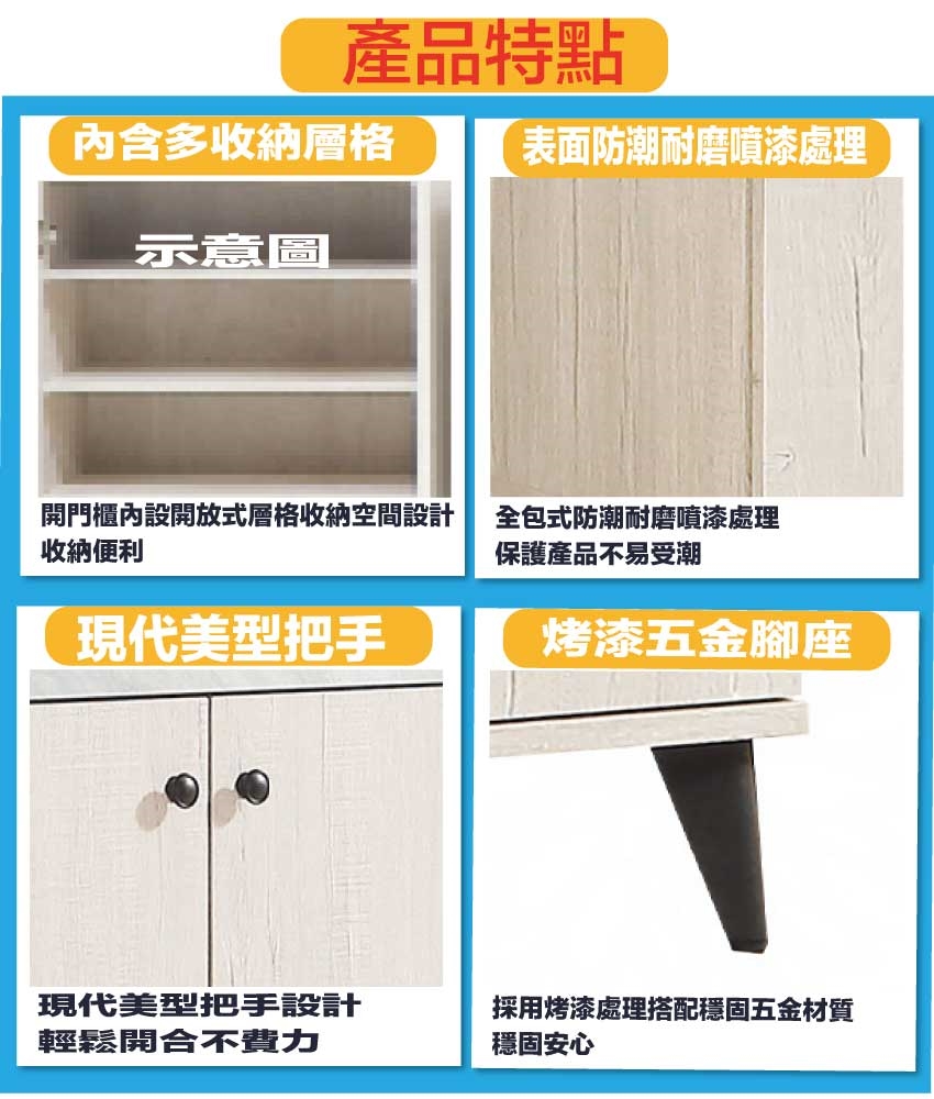 採用防蛀木心板+五金滑軌結構+烤漆五金腳座+防夾手緩衝門片五金+仿石紋耐磨美耐皿材質面板等安心材質製造