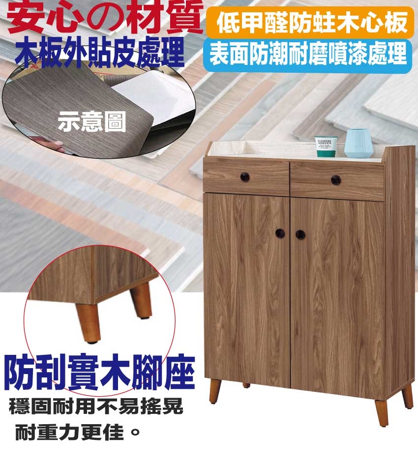 ★偏遠地區需額外加收運費,下標請先問與答詢問★ ★下訂前注意 由於商品流動較快,下訂前請先詢問是否有貨在下訂喔~★ 【綠家居】卡格淺柚2.7尺二門二抽鞋櫃 淺柚木紋色系+安心材質製造,使用放心+搭配居家更便利,採用防蛀木心板+防刮實木腳座+防夾手緩衝五金等安心材質製造 ,外層採用防潮耐磨噴漆處理搭配採用開門櫃+二抽屜+內&外開放層格等收納空間設計,全由專人配送到家,專業安心服務,替你省下更多時間!