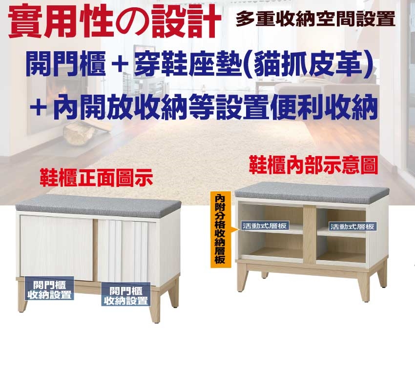 搭配採用穿鞋坐墊+開門櫃+內開放層格等收納空間設計