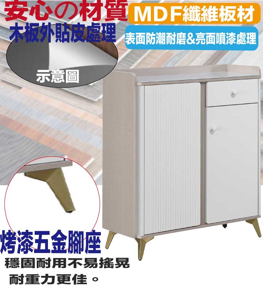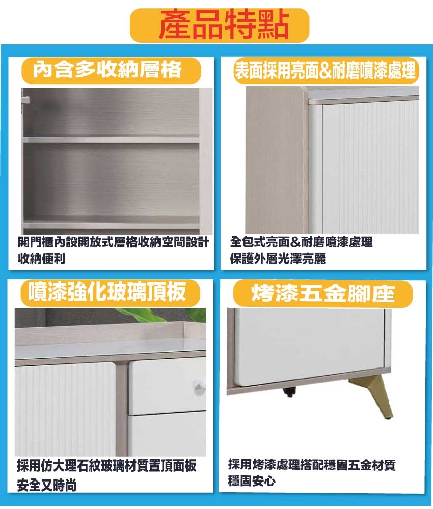 材質:防潮MDF板+烤漆金屬腳座+防夾手緩衝門片五金+3mm仿大理石紋強化玻璃頂板