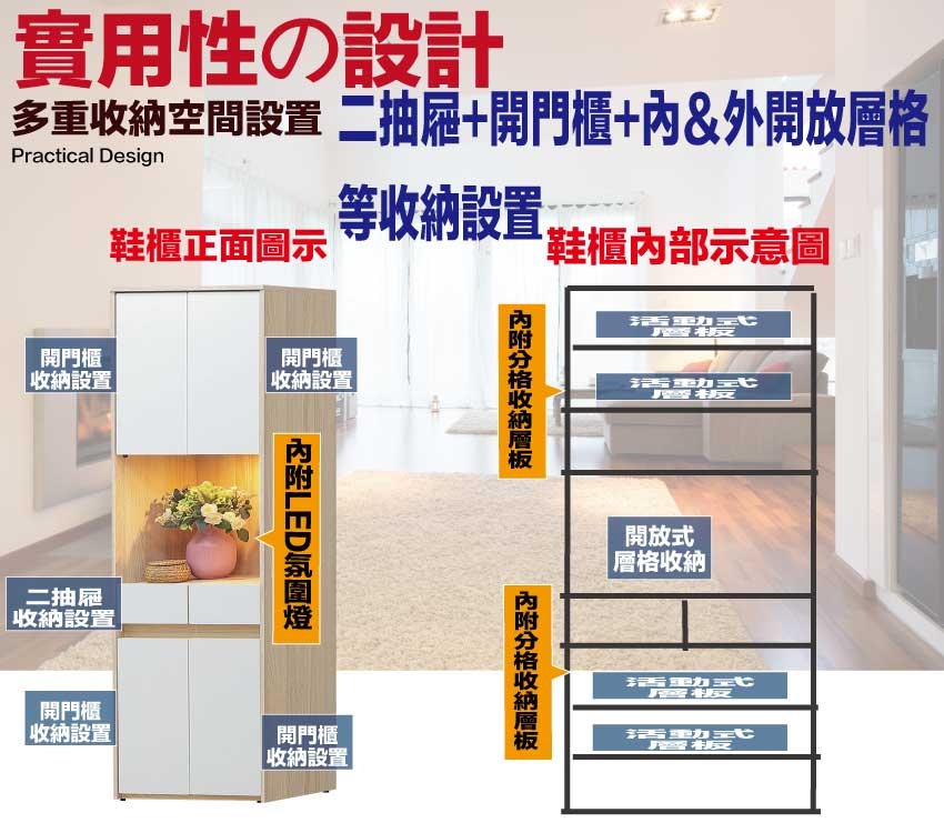 搭配採用開門櫃+二抽屜+開放式層格+LED燈等收納空間設計