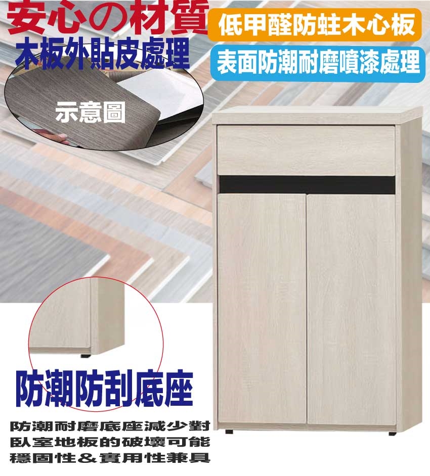 ★偏遠地區需額外加收運費,下標請先問與答詢問★ ★下訂前注意 由於商品流動較快,下訂前請先詢問是否有貨在下訂喔~★ 【綠家居】達斯2尺單抽二門鞋櫃 淺橡雙色系+安心材質製造,使用放心+搭配居家更便利,採用防蛀木心板+防刮耐磨底座+防夾手緩衝五金等安心材質製造 ,外層採用防潮耐磨噴漆處理搭配採用開門櫃+單抽屜+內開放式層格等收納空間設計,全由專人配送到家,專業安心服務,替你省下更多時間!