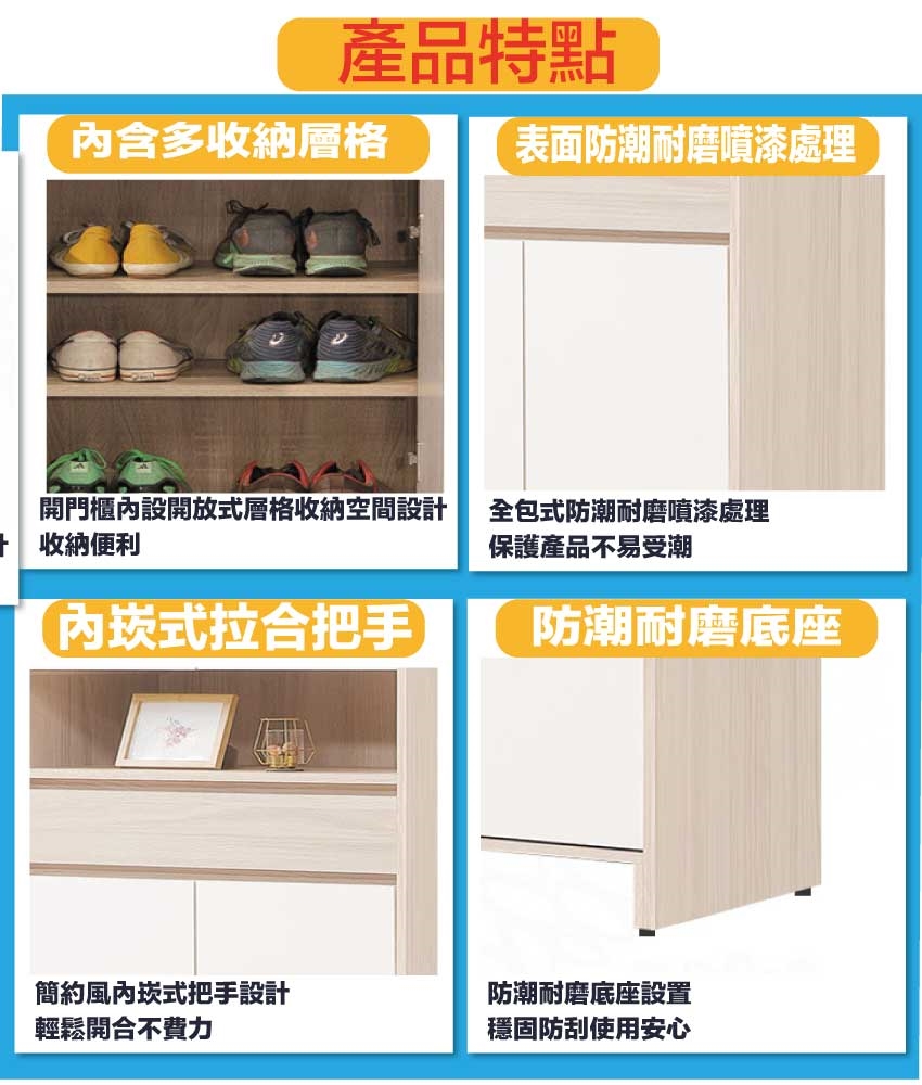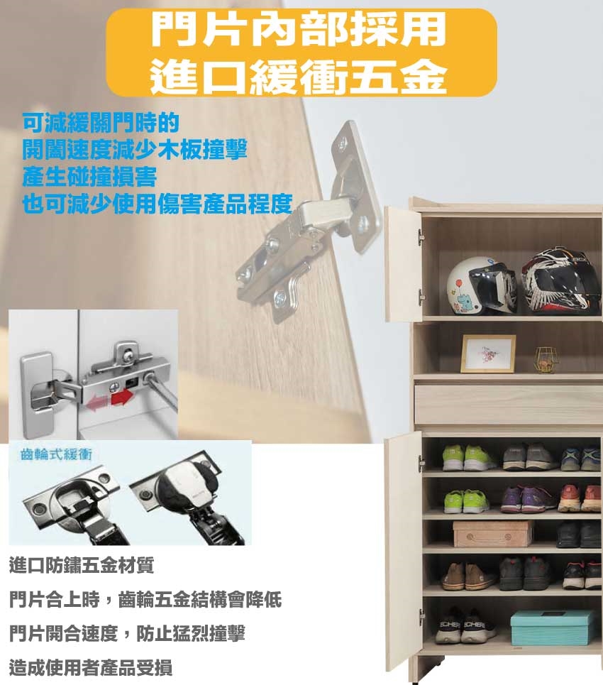 材質:防蛀木心板+防潮耐磨底座(可調高低水平)+防夾手緩衝門片五金 -