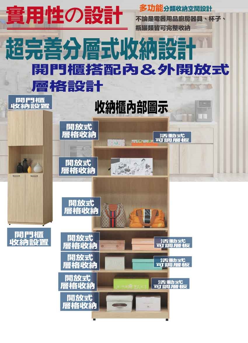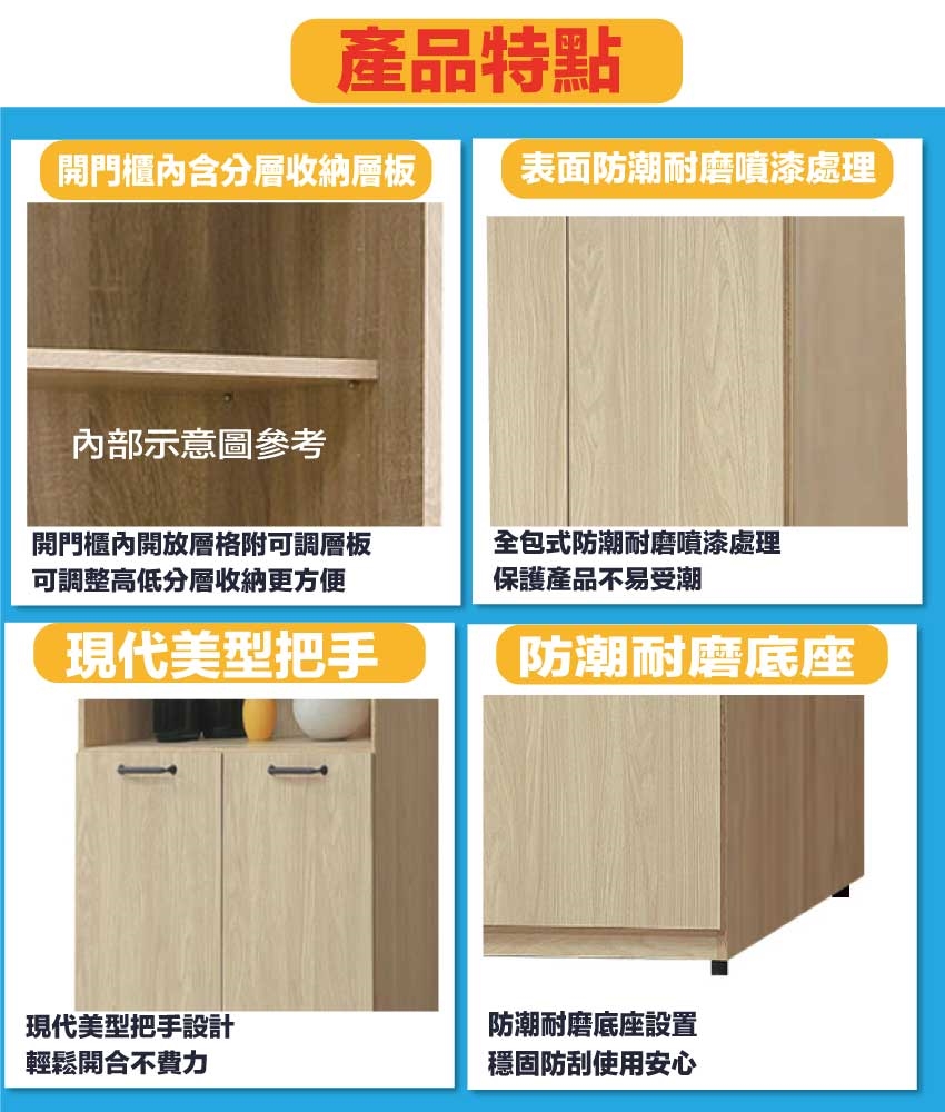 材質:防蛀木心板+防潮耐磨底座(可調高低水平)+防夾手緩衝門片五金 -